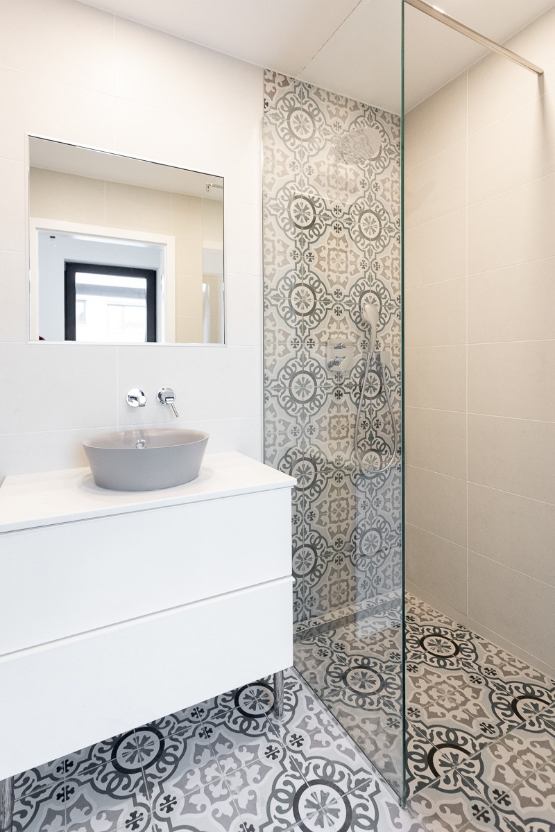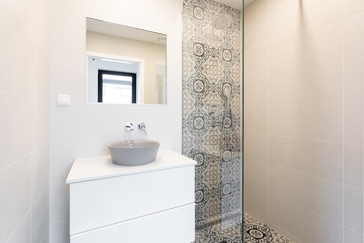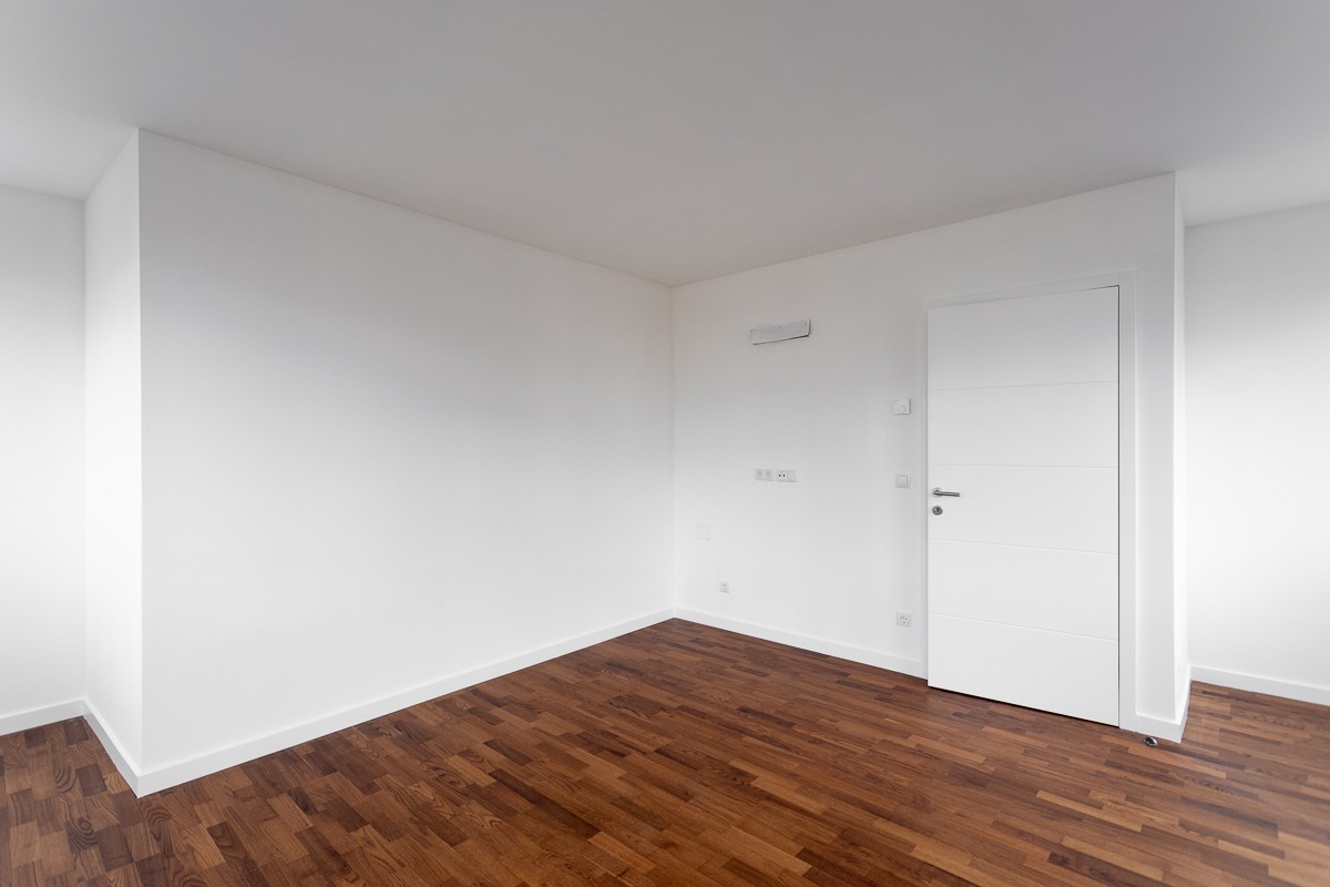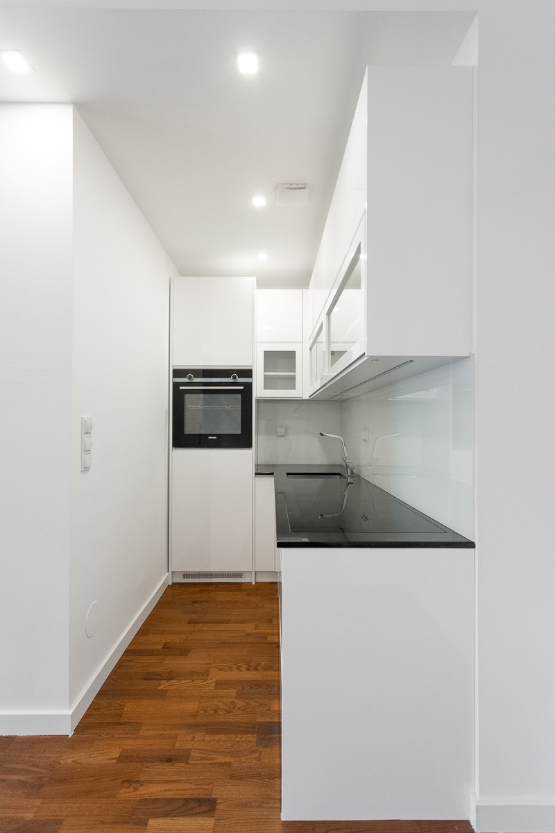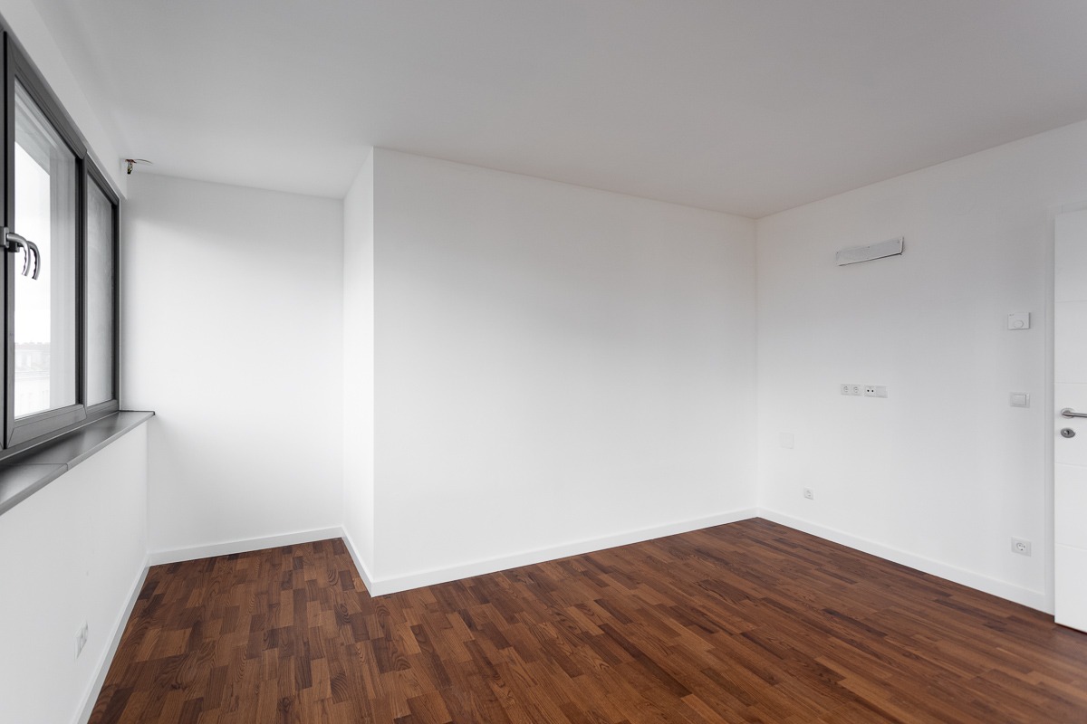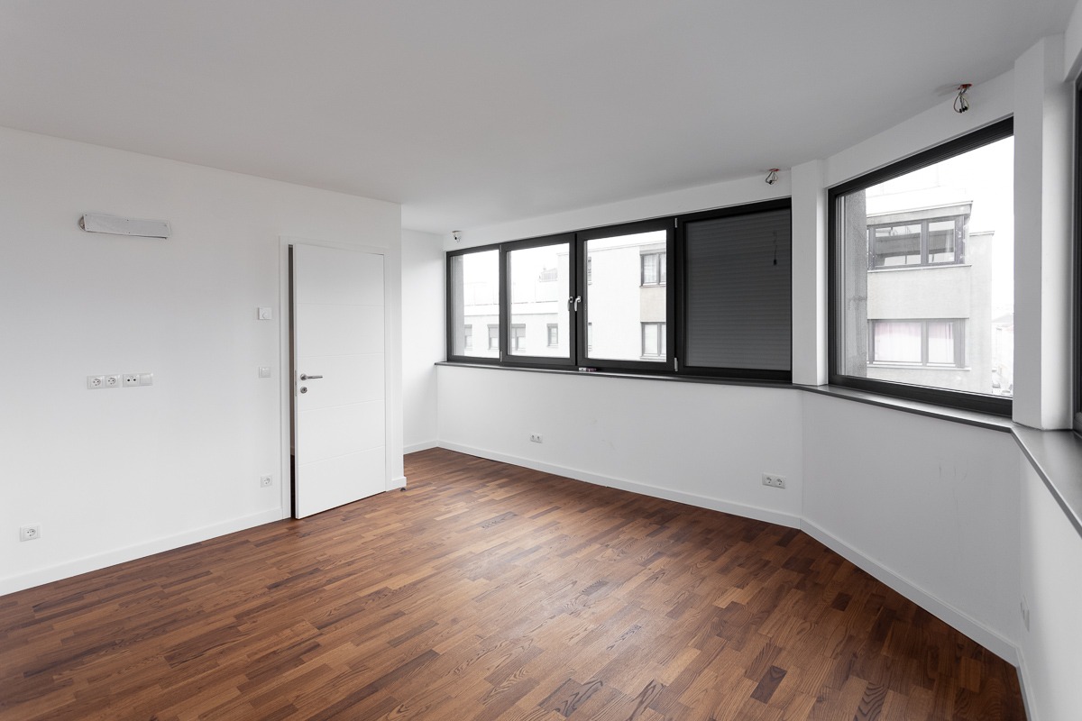 Das große Eckschlafzimmer mit Fensterfront bietet einen angenehmen Fernblick und schafft einen ruhigen Rückzugsort. Das Badezimmer ist mit einer großen Walk-In-Dusche und einem Waschmaschinenanschluss ausgestattet, ergänzt durch ein odvojeni WC. Die durchdachte Raumaufteilung, hochwertige Materialien und die klare architektonische Linie verleihen der Wohnung ein modernes und zugleich wohnliches Ambiente.